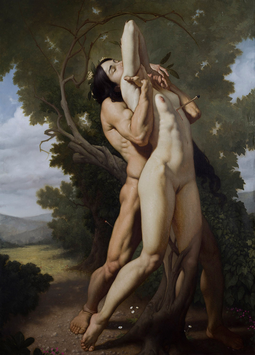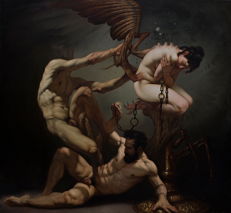 Sus personajes, inspirados en figuras como Eros, Apolo, las ninfas o los héroes trágicos, parecen surgir de un universo suspendido entre el sueño y la pesadilla.